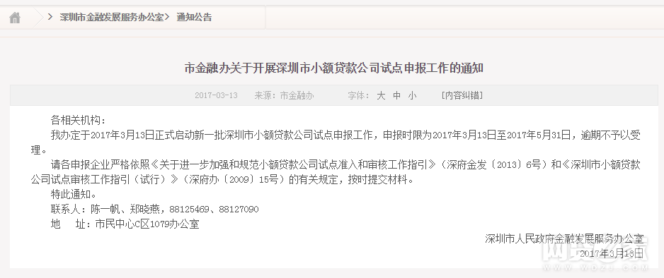 网络整理 2021-03-22 22:23网贷之家讯 3月13日消息,深圳金融办发布《市金融办关于开展深圳市小额贷款公司试点申报工作的通知》(以下简称《通知》),定于2017年3月1日正式启动新一批深圳市小额贷款公司试点申报工作,申报时限为2017年3月1日至2017年5月31日,逾期不予以受理。