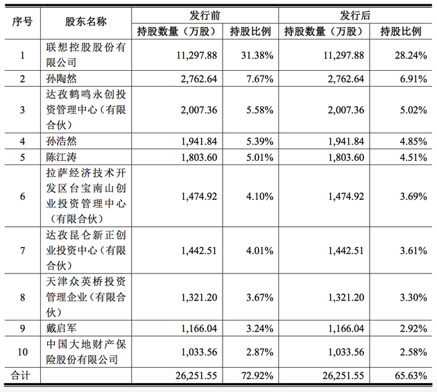 发行前后公司前十大股东情况招股书披露,持股5%以上的股东依次为联想控股、孙陶然、鹤鸣永创、孙浩然及陈江涛。截至招股说明书出具日,联想控股持有公司31.38%的股份,为公司第一大股东。考虑到公司在实际经营中无任何单一股东对发行人的经营方针及重大事项的决策能够决定和作出实质影响,因此公司无实际控制人。招股书将此归结为“无实际控制人的风险”。