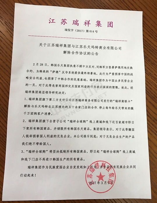 江苏瑞祥告诉中国支付网,除了预付卡业务停止合作外,瑞祥旗下的“瑞祥全球购”线上商城和线下近百家超市即日下架所有韩国商品,并销毁所有韩国乐天商品。