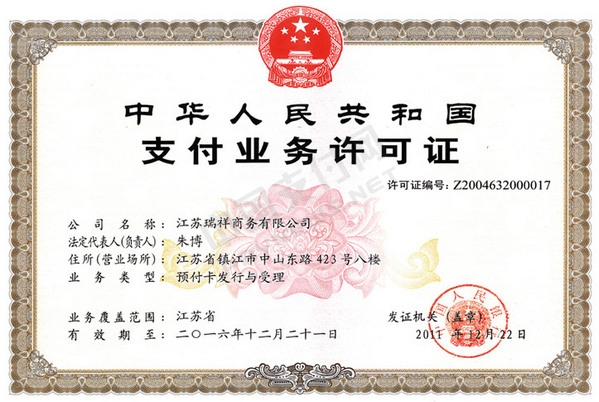 江苏瑞祥商务有限公司是经中国人民银行正式批准的第三方支付机构,获准在江苏省内经营预付卡业务。12月20日,以江苏省预付卡行业的最高评分成功通过央行续展。