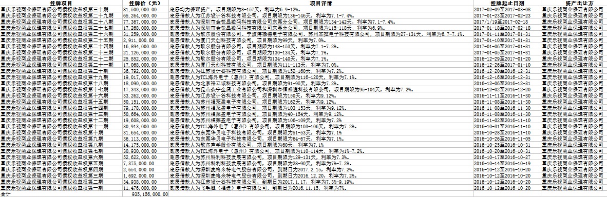 经统计,重庆乐视商业保理有限公司在深圳市招银前海金融资产交易中心上述30期挂牌项目,挂牌价格累计约9.35亿元。