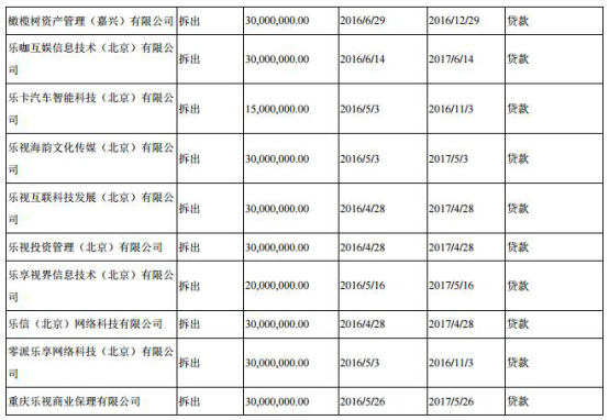 “财镜”查询乐视网2016年半年报发现,橄榄树资产管理(嘉兴)有限公司借给乐视网两笔资金,一笔116.9万元,一笔4488.9万元,起止日期分别为2016/6/9~2016/11/3、2016/6/28~2016/12/25,用于卖出回购金融资产;乐视网借给橄榄树资产管理(嘉兴)有限公司、乐视投资管理(北京)有限公司、重庆乐视商业保理公司各3000万元,起止日期分别为2016/6/29~2016/12/29、2016/4/28~2017/4/28、2016/5/26~ 2017/5/26。