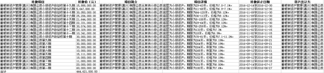 2016年6月23日至2016年12月14日,橄榄树资产管理(嘉兴)有限公司在深圳市招银前海金融资产交易中心挂牌项目共19期,挂牌项目为橄榄树资产管理(嘉兴)有限公司从其他小贷公司受让的债权收益权,底层为小贷资产,挂牌项目的资产出让方为橄榄树资产管理(嘉兴)有限公司。项目期限几十天到数百天不等,价格在6.9%~11.2%之间。