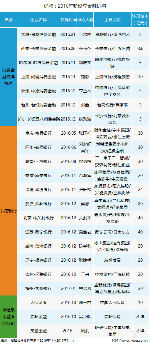 2)此外,2016年新成立持牌消费金融机构由2015年的15家扩容至22家,除了地方商业银行以外,携程旅游、萨摩耶金服、58同城、汇通信诚、奇飞翔艺、上海众家电子商务等新兴企业参股入局。
