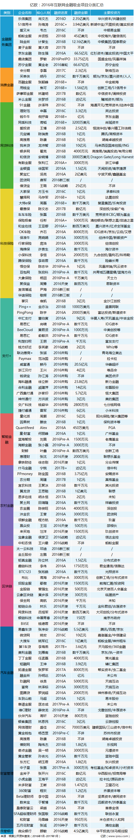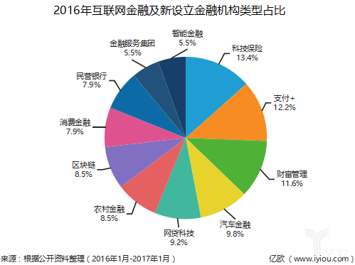 在此背景下,亿欧筛选并梳理了2016年获得风险投资的142家互联网金融企业以及22家新成立新型金融机构(考虑到政策审批的延迟等时间因素,2017年初的企业动态也包括在内),覆盖金融服务集团、消费金融、网贷科技、科技保险、支付+、智能金融、农村金融、区块链、汽车金融、财富管理、民营银行11个大类别。