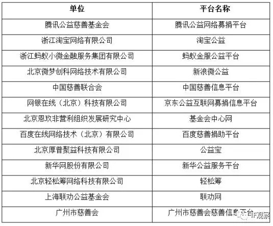 2016年8月30日,民政部公示了首批慈善组织互联网募捐信息平台名单,13家平台入选,包括“腾讯公益”、淘宝网、蚂蚁金服公益平台、新浪-微博(微公益)、轻松筹、中国慈善信息平台、京东公益等。