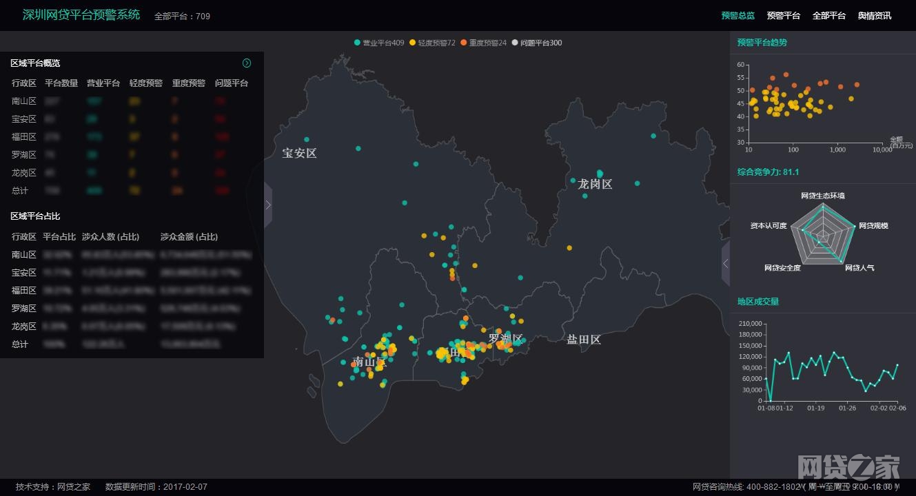 交易数据主要监测网贷平台的成交量、待还金额、收益率、资金流量、投资人数等数据的异常波动,交易数据发生较大变化时会对网贷平台进行相关预警。