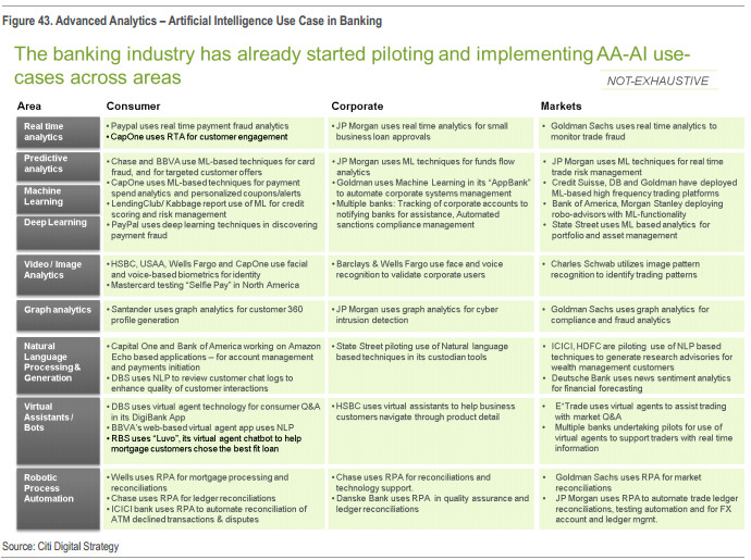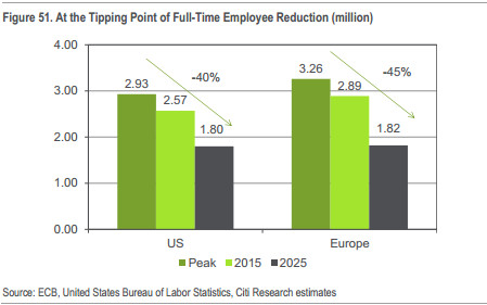人工智能和自动化在金融服务的广泛采用将产生深远的影响,包括产品销售,客户服务,最后改变既存银行的成本结构。花旗报告显示,随着移动互联网渗透的增加、FinTech竞争的加剧,已经利润增长压力的加大下,按照2104年银行职工峰值水平计算,发达市场的银行分支机构预计将继续削减30-50%。
