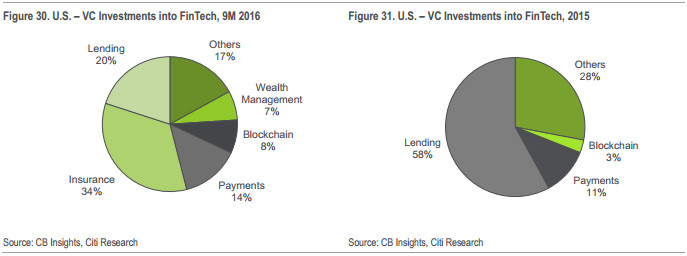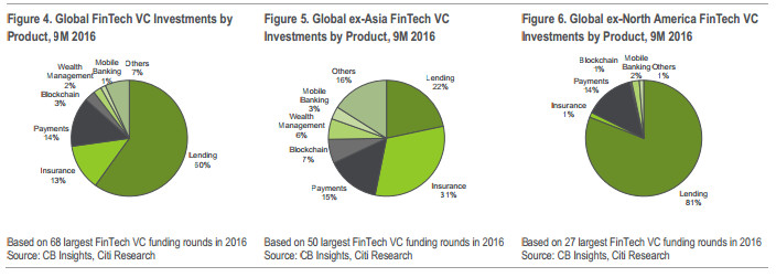 2016年获得VC最多的产品领域,呈现出在中国以信贷为主,在美国以保险为主的分化趋势,但如果将2016年第二季度私募股权融资的份额加上再统计会发现,支付行业占据了2016年前9个月全球FinTech投资的50%左右。