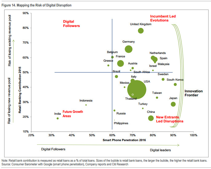 更进一步地说,分支机构和员工裁减的差异因市场而异。花旗将影响银行制定怎样的新商业模式的关键因素归结为:劳动法的灵活性和社会的数字化发展程度——如果一个地区的劳动法较为僵化,银行裁员难度大,反之则越容易。而社会的数字化储备良好的话,那么银行裁员给其市场份额和客户满意度带来的影响越小。