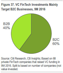 美国市场在过去更吸引FinTech投资的是B2C的商业模式,这在今天的中国市场尤其如此。据统计,在2016年前9个月,60%的FinTech投资涌向B2C金融科技企业。
