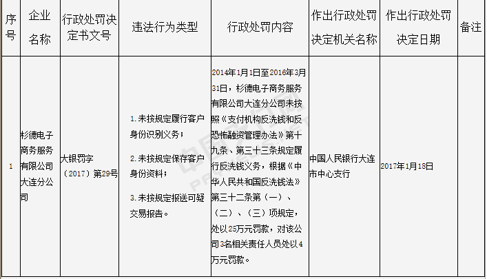 处罚决定书显示,2014年1月1日至2016年3月31日,杉德电子商务服务有限公司大连分公司未按照《支付机构反洗钱和反恐怖融资管理办法》第十九条、第三十二条规定履行反洗钱义务,根据《中华人民共和国反洗钱法》第三十二条第(一)、(二)、(三)项规定,处以25万元罚款,对该公司3名相关责任人员处以4万元罚款。