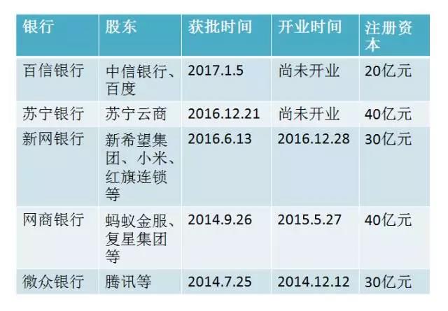 从2016年末到2017年初,百信银行、苏宁银行相继获批,百度和苏宁两家也都在新金融行业里再进一步。根据监管规定,获批银行的筹建期只有6个月,最长不能超过9个月,也就是说这两家银行都将在2017年内开业。再加上刚刚获准开业的新网银行,小米在过去一年里把金融版图迅速充实起来,几家民营银行在2017年的竞争也将进入白热化。