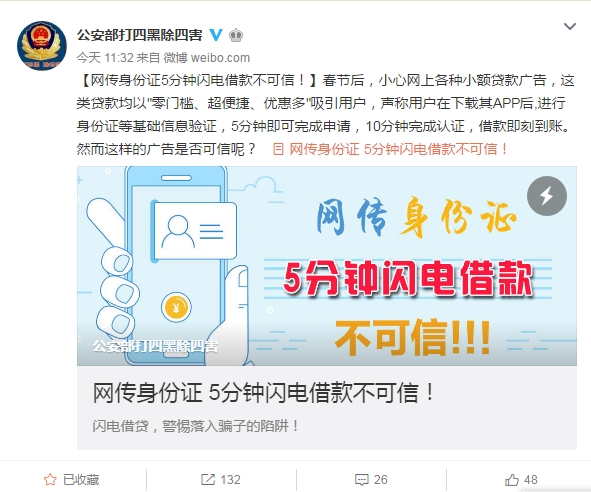 公安部辟谣:凭身份证5分钟闪电贷款 不可信