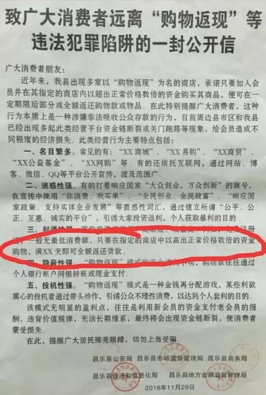 山东潍坊昌乐市五部门发布公开信提醒“消费返现”骗局