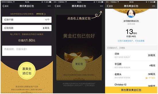 毕竟去银行购买黄金产品往往都要在一克以上,而黄金红包的推出则能让用户在已经熟悉的余额宝、理财通之外,利用“腾讯微黄金”平台实现更多元的理财方式。