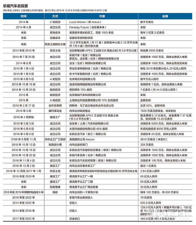 他在专访中透露,乐视汽车业务已投入“一百五六十亿”,而要实现量产,总投入“至少也得400亿到500亿元”。这就是说,乐视还需要投入240亿到350亿元到汽车业务。而按照《财经》记者的统计,资金缺口在460亿元以上(见附表:乐视汽车总投资)。
