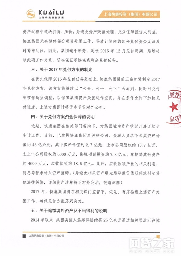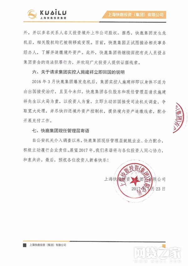 此外,在1月23日,快鹿集团曾于其官网上发表了《告投资人书》,其中提到,截至目前,快鹿已经兑付近7亿元,且由于种种压力,将延长2016年12月的兑付周期。另,快鹿已对集团境内资产状况展开了初步审计工作。最后,文中提到将对施建祥的25亿境外资产进行追缴。