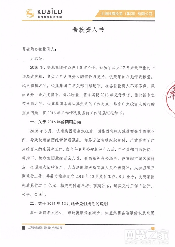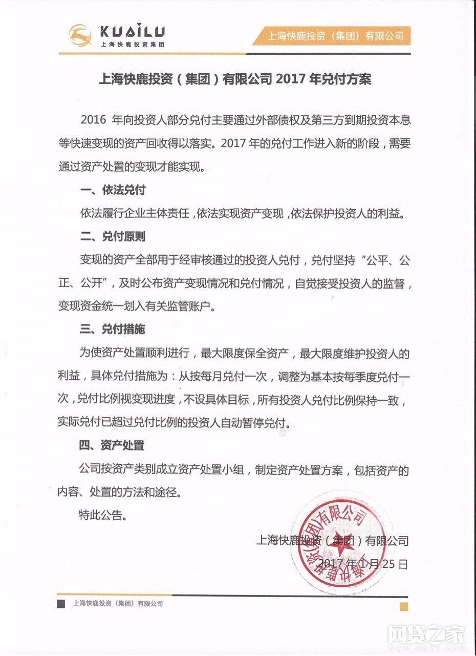 网络整理 2021-03-22 22:581月25日,上海快鹿投资集团在其官网上发布了一则关于2017年兑付方案的公告。公告称,2017年的兑付工作进入新的阶段,需要通过资产处置的变现才能实现。另外,公告中还表明:之后的兑付工作将从每月兑付一次调整为基本按每季度兑付一次。