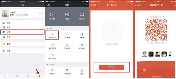 “面对面红包”的体验类似于春节收发红包真实场景。用户更新至最新版本的微信(6.5.4版本)后,通过微信客户端“我—钱包”入口,点击“面对面红包”,选择红包金额、数量后手机上即可显示“红包二维码”,身边的人通过扫描发红包的人的手机上的二维码即可获得红包。