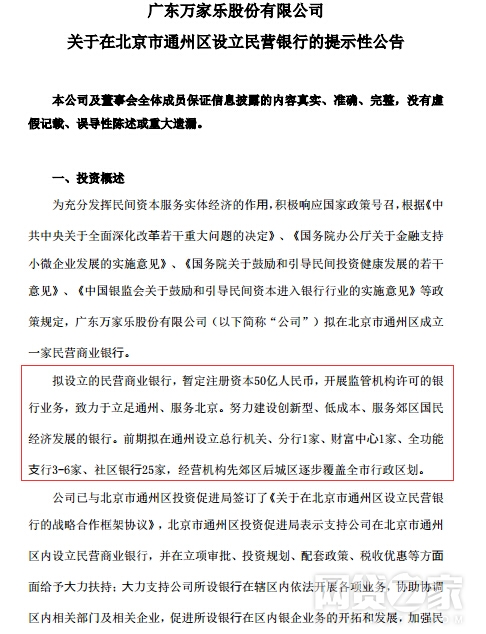转载请标注:信息网——万家乐拟在北京开设民营商业银行 注册资本50亿