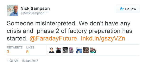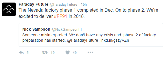 在Sampson的推文中,其引用了国内某报纸的中文微博截图,并推送给了Faraday Future的帐号。Faraday Future的官方帐号随后转发了这条推文,并称,内华达州工厂第一阶段已经于12月完成。在第二阶段,会于2018年交付FF91汽车。据称,Sampson或其团队的中文水平应该没有那么好。