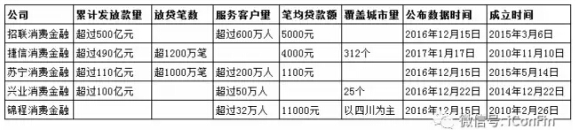 从2016年12月开始,各持牌机构纷纷晒成绩单,截至到目前,已公布数据的持牌机构有招联消费金融、捷信消费金融、苏宁消费金融、兴业消费金融、锦程消费金融,各家数据如下: