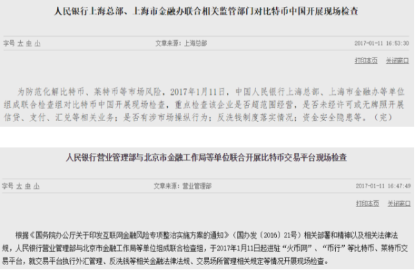 据央行上海总部和央行北京营业管理部,1月11日,央行检查组今日先后进驻“比特币中国”、“火币网”、“币行”等比特币、莱特币交易平台,就交易平台执行外汇管理、反洗钱等相关金融法律法规、交易场所管理相关规定等情况开展现场检查。