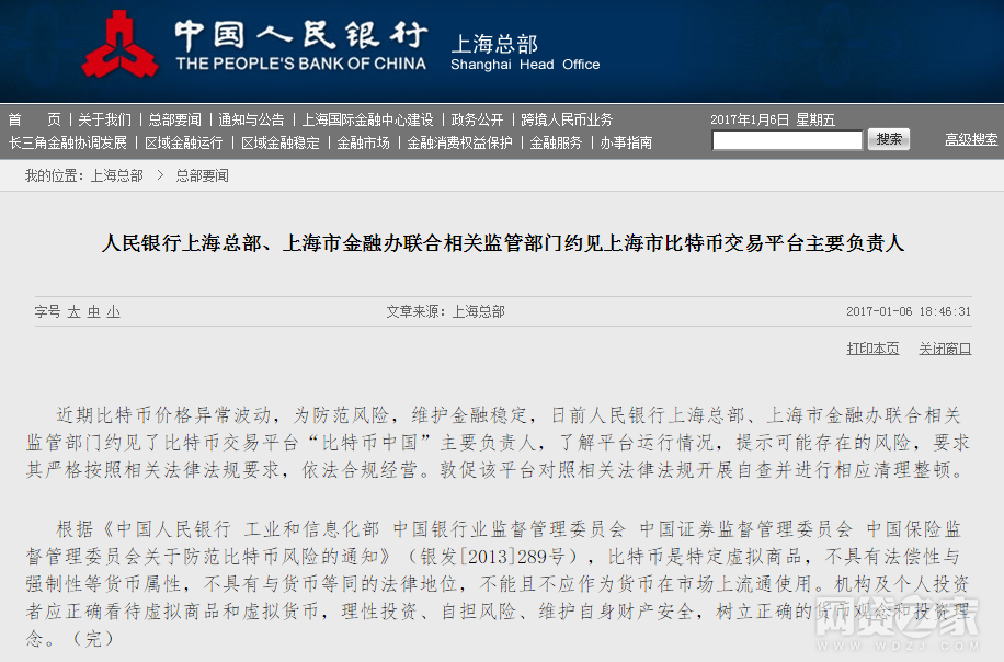 公告表示,近期比特币价格异常波动,为防范风险,维护金融稳定,日前人民银行上海总部、上海市金融办联合相关监管部门约见了比特币交易平台“比特币中国”主要负责人,了解平台运行情况,提示可能存在的风险,要求其严格按照相关法律法规要求,依法合规经营。敦促该平台对照相关法律法规开展自查并进行相应清理整顿。