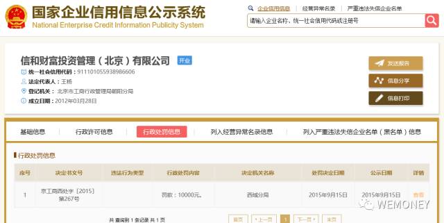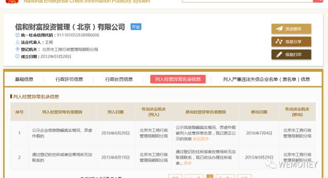 国家企业信用信息公示系统显示,2016年6月20日,信和财富因其公示信息隐瞒真实情况、弄虚作假,被北京市工商行政管理局朝阳分局列入经营异常名录。不过,在7月4日更正公示信息后即被移出。此前的2015年9月15日,信和财富被北京市工商行政管理局西城分局处以1万元罚款。