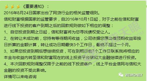 事实上,自去年10月以来,多家第三方论坛就陆续出现关于信和财富延期兑付的质疑帖。根据投资人展示的由业务员发布的“重要通知”,信和财富根据监管要求,自2016年10月1日起,对于之前在信和财富进行线下投资的客户到期之后的回款规则做出调整:自客户投资到期之日起,信和财富为客户寻找债权受让人;转让未成功前,客户持有等待期间收益,转让成功日期最快3个工作日,最晚不超过一个月。