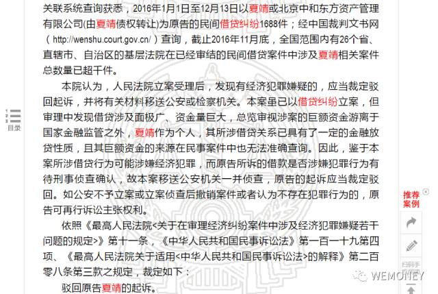 裁定书显示,据江苏省镇江市京口区法院统计,仅2016年3月至11月间,该院共受理夏靖为原告的民间借贷纠纷154 件、以债权受让人北京中和东方资产管理有限公司为原告的民间借贷纠纷87件,借贷总标的额近2000 万元。此外,经江苏省高级人民法院全省案件关联系统查询获悉,2016年1月1日至12月13日以夏靖或北京中和东方资产管理有限公司(由夏靖债权转让)为原告的民间借贷纠纷1688件;经中国裁判文书网(http://wenshu.court.gov.cn/)查询,截止2016年11月底,全国范围内有26个省、直辖市、自治区 的基层法院在已经审结的民间借贷案件中涉及夏靖相关案件总数量已超千件。