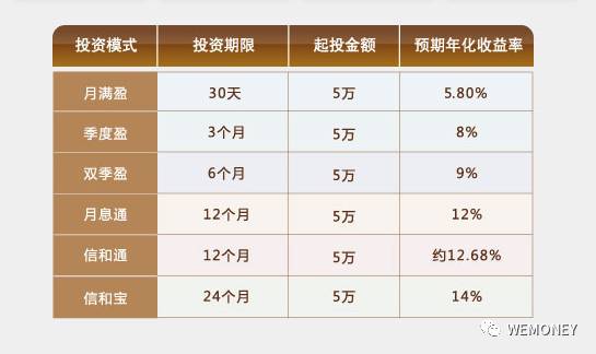 凤凰WEMONEY了解到,信和财富此前通过线下销售的理财产品包括“月满盈”、“季度盈”、“双季盈”、“月息通”、“信和通”、“信和宝”,理财期限从30天~24个月不等,预期年化在5.80%~14%之间,起投金额均为5万元。另据王林透露,出现延期兑付的项目主要包括信和通、月息通等。