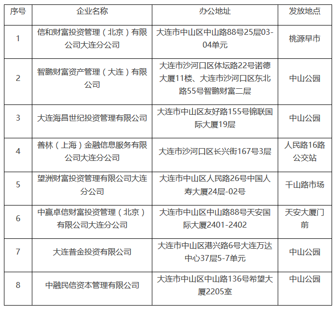 大连市处置非法集资领导小组办公室在公告中称,以上企业在我市各公园、超市、早晚市场和商场向不特定对象发布各类投资理财宣传资料,承诺年化收益8%~15%不等,经与相关部门核实,上述企业属于普通类工商企业,不具备对社会公众开展投资理财业务的牌照和资质,不能建立资金池,不能从事与投(融)资理财业务相关的金融业务,更不得以任何名义、任何形式向社会不特定对象吸收资金。公告还提醒广大市民,不要轻信高收益、高回报广告,不要被新名词、新形式所蛊惑,不要参与或从事非法集资。