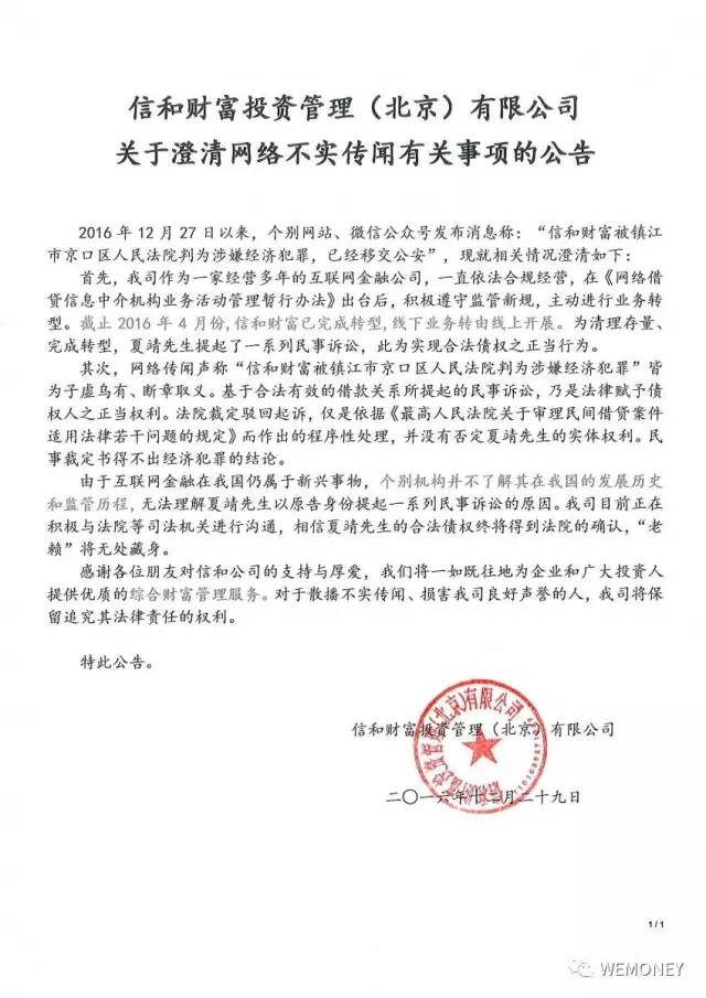 对此,2016年12月29日,信和财富发表《关于澄清网络不实传闻有关事项的公告》。公告称,截止2016年4月,信和财富已完成转型,线下业务转由线上开展。为清理存量,完成转型,夏靖提起了一系列民事诉讼。此外,法院裁定驳回起诉,仅是依据《最高人民法院关于审理民间借贷案件适用法律若干问题的规定》而做出的程序性处理,并没有否定夏靖的实体权利。信和财富目前正在与法院等司法机关进行沟通。