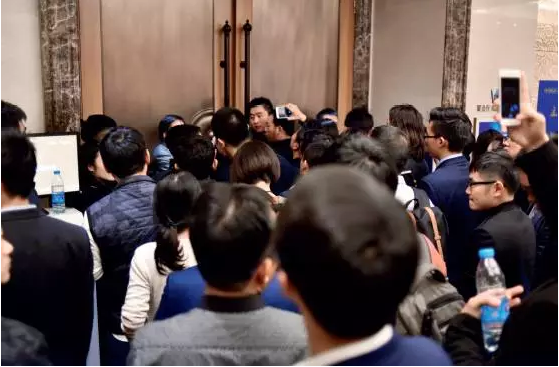 (贾跃亭闭门演讲时,门外挤满了人,不时有人咚咚砸门,要求进场。摄影|史小兵)