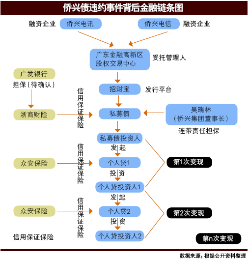 根据产品合同,项目的设计引入“双重担保”:一是信用保证保险,二是侨兴集团实际控制人吴瑞林的无限连带责任担保。其中,浙商财险为侨兴私募债进行保证保险承保,对债券的本息到期兑付提供保证保险,且不得以任何事由拒绝向投资人赔付,但是浙商财险之所以敢于保险,是因为侨兴方出具的广发银行惠州分行的履约保函,即广发银行为浙商财险担责。受此次私募债逾期影响,未能按期收到借款本息的招财宝个人贷客户则由众安保险承保。