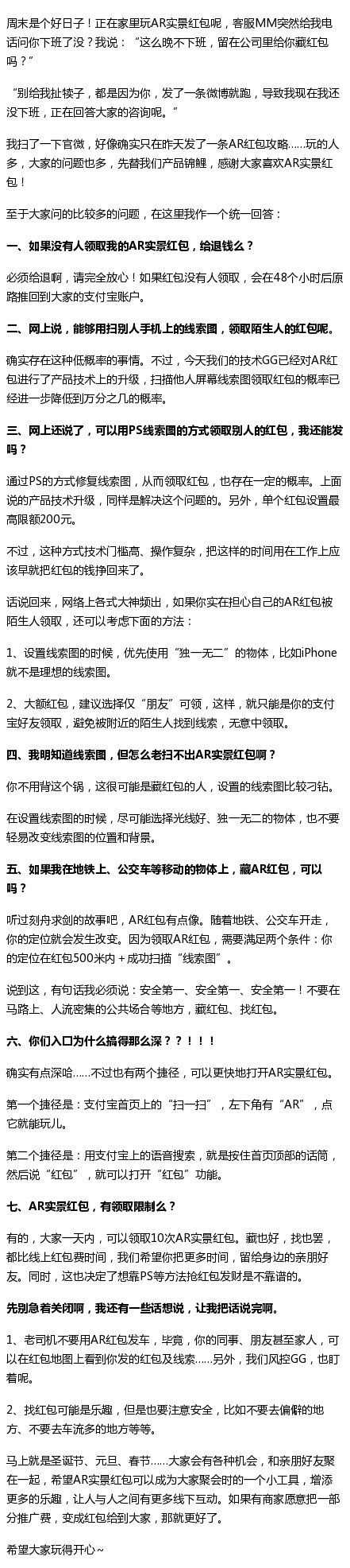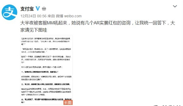 对此,支付宝官方发布微博表示,已经对AR红包进行了产品技术上的升级,扫描他人屏幕线索图领取红包的概率已经进一步降低到万分之几的概率,通过PS抢到红包的概率也大幅降低。
