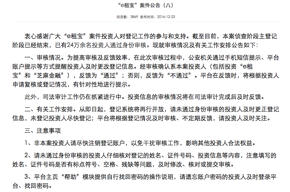 转载请标注:信息网——e租宝最新进展:24万余名投资人通过身份审核