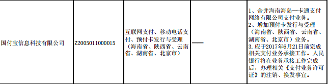 而上海点佰趣信息科技有限公司和海航旗下国付宝被要求合并支付牌照。具体为,上海点佰趣信息科技有限公司被要求合并温州之民信息服务有限公司支付业务。海航旗下国付宝信息科技有限公司被要求合并海南岛一卡通支付网络有限公司支付业务。