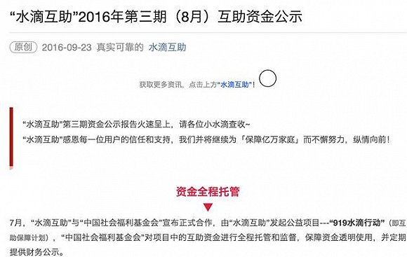 据水滴互助方面介绍,“水滴互助”与“中国社会福利基金会”在7月份宣布正式合作,由“水滴互助”发起公益项目—“919水滴行动”(即互助保障计划),“中国社会福利基金会”将对项目中的互助资金进行全程托管和监督,保障资金透明使用,并定期提供财务公示。