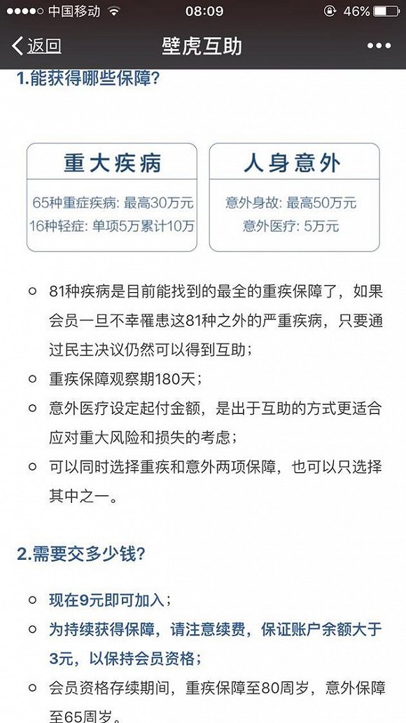 “一份基于人类本性的契约,尘封已久的兽皮封面,一角已被徐徐掀起……’全民互助计划’重磅上线,意外及81种重疾互助,9元加入,30万保障,还可以添加家人。”这是微信公众号“壁虎互助”的官方介绍。