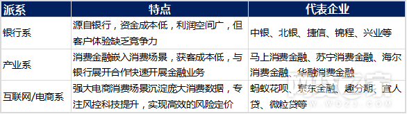 政策开放后,在七年发展历程之后,消费金融产业呈现三足鼎立格局,互联网平台入局加速释放产业活力。自2009年国家试点消费金融以来,国内消费金融市场主体不断涌现,银行、传统零售企业、电商、保险甚至P2P平台都纷纷布局个人消费金融领域。中泰证券从发起机构的角度将消费金融市场参与者主要分为三类:银行系、产业系和电商系。三个派系各有优势。