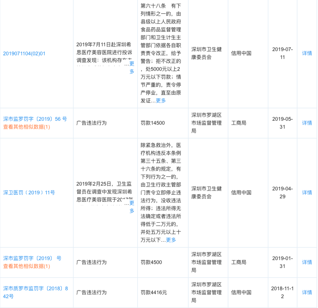 除此之外,2018年11月12、2019年1月31、2019年5月31日,希思医美三次因广告违法行为,遭到深圳市罗湖区市场监督管理局处罚。