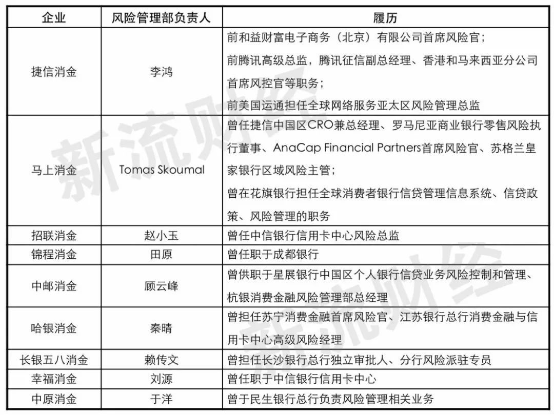 虽然消金公司对风控人员需求旺盛,但一般在任命“守门人”时会相当谨慎。新流财经盘点了几家持牌消费金融公司的风险管理部负责人,从他们的以往履历中可以窥见一些规律。(因各企业相关职位名称不同,统称负责企业风控体系建设、负责规划和制定相应的风险管理政策与策略的风控领导人为风险管理部负责人,即CRO)。