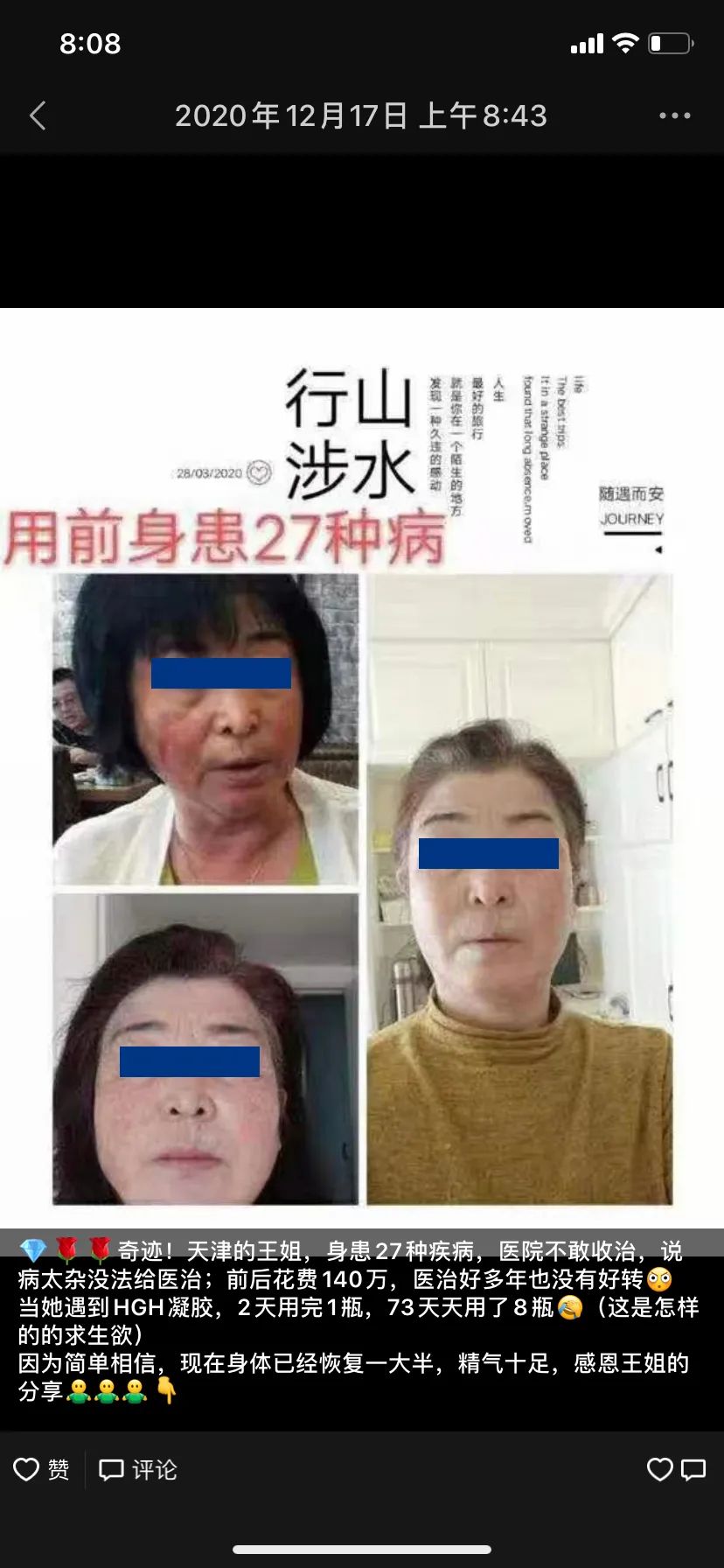 “奇迹!天津的王姐,身患27种疾病,医院不敢收治,说病太杂没法给医治;前后花费140万,医治好多年也没有好转。当她遇到HGH,2天用完1瓶,73天用了8瓶。因为简单相信,现在身体已经恢复一大半,精气十足。”
