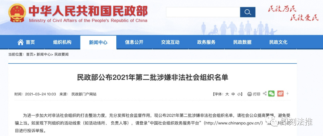 截止目前,民政部于2021年共公布了20个涉嫌非法社会组织,名单如下: