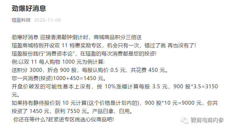2020年11月6日,官方发布《劲爆好消息》:迎接香港敲钟倒计时,商城商品积分三倍送,瑄盈商城特别开设双11特惠奖励专区,瑄盈股份践行“消费资本论”,在瑄盈的每次消费都是您的投资,以双11每人购物1000元为例计算:送积分3000,折合900股,每股认购价0.5元,共花费450元。您一共消费(投资)1000+450=1450元。开盘价破发的可能性基本上没有,按10%涨幅计算每股3.5元,900股*3.5=3150元。如果持有静待股价到10元计算(这个价格是计划内的),900股*10元=9000元,你共投资了1450元,获利7550元。产品白拿、白用。
