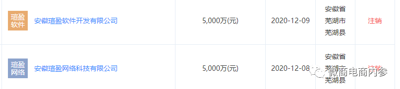 据爱企查显示,王志正名下还有两家公司,这两家企业名为安徽瑄盈软件开发有限公司和安徽瑄盈网络科技有限公司,成立时间都在2020年12月上旬,而诡异的是,转过年来,这两家注册资本同样高达5000万元的企业都已处于注销的经营状态。