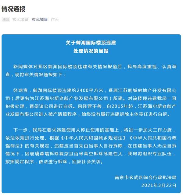 通报称,经调查,御湖国际楼顶违建约2400平方米,系原江苏明城房地产开发有限公司(后更名为江苏海尔斯老龄产业发展有限公司)所建。对该楼顶违建我局一直积极处理,督促该公司进行自拆。因经营不善,自2015年起,江苏海尔斯老龄产业发展有限公司进入破产清算程序,始终没有履行违建拆除主体责任进行自拆。